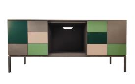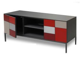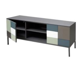 Dimensions : l 130 x h 57 x p 42 cm Meuble TV 130 cm 2 Niches – 2 Portes Etagères réglables, fond ajouré pour le passage de câbles Piétement métal laqué Collection : Quadrik