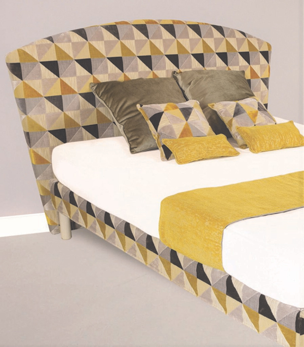 Paget Tête de lit trapézoïdale avec un dossier arrondi, elle est mise en valeur avec un un tissu géométrique très tendance à dominante jaune. Toutes nos têtes de lits sont réalisables sur mesure. Pour chaque tête un immense choix de tissus est proposé. Fabrication française. Tête de lit Vanina pour CHR, tête de lit française.