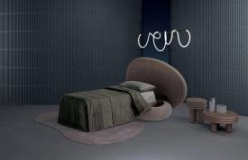 Pouf-lit transformable avec rangement et dossier “flottant”. Mécanisme : sommier à grille électrosoudée standard sans porte-oreiller. La mécanique et le matelas sont recouverts d’une housse en tissu déhoussable. Structure : aggloméré de bois, contreplaqué et lattes en sapin. Matelas standard : polyuréthane stretch D.30, hauteur 13 cm. Assise : polyuréthane densité 35 kg/m³. Dossier : polyuréthane densité 24 kg/m³. Options : dossier supplémentaire, matelas. Revêtement : tissu entièrement déhoussable. Le modèle est disponible exclusivement avec les tissus de la catégorie F BI-ELASTIC. Le modèle est disponible en versions avec bureau, avec rangement et en version GYM. Cette dernière comprend uniquement un tapis roulant électrique, équipé d’une prise électrique et atteignant une vitesse maximale de 10 km/h. Plateau du rangement et bureau disponibles en plusieurs finitions.