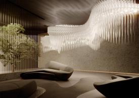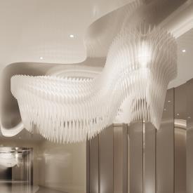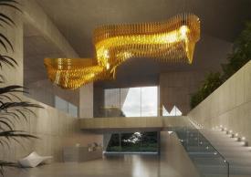 Slamp Design Zaha Hadid À l’occasion du 10e anniversaire de la collaboration entre Slamp et Zaha Hadid Design, la version modulaire de l’emblématique Aria est née. La sculpture est composée d’un corps éclairant qui crée des ondes sinusoïdales dans l’espace, enveloppée de couches de polycarbonate toutes différentes les unes des autres, créant un design fluide et visionnaire. Réalisée sur mesure pour des projets personnalisés. Couleur: Gold Longueur du câble: 6 mt Couleur du cordon: Transparent Materiaux: Polycarbonate, Lentiflex® Éclairage: 30 X 12W E27 LED Filament Bulbs + 8 X 12W Spot LED PAR 38 Poids: net 210 Kg - gross 360 Kg Dimmable: No lampe suspension
