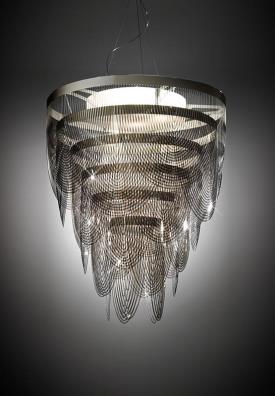 Slamp Design Bruno Rainaldi Dimensions : l 90 x h 110 x p 90 cm Ceremony est une lampe opulente, une ode à la féminité qui évoque l'image de la brosse d'une jupe, un collier en perles ras du cou, draperie sur decoltè. Les cinq sources lumineuses sont réparties sur des « colliers » technopolymères qui apportent un air de drame et d'apesanteur intrinsèque à sa puissante présence. Couleur: Fumé Longueur du câble: 1.5 mt Couleur du cordon: Transparent Materiaux: Cristalflex® Éclairage: 4 X 12W E27 LED Filament Bulbs + 1 X 8W GU10 SPOT LED Poids: net 15 Kg - gross 22 Kg Dimmable: dimmable bulbs needed, depending on wall dimmer lampe suspension